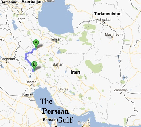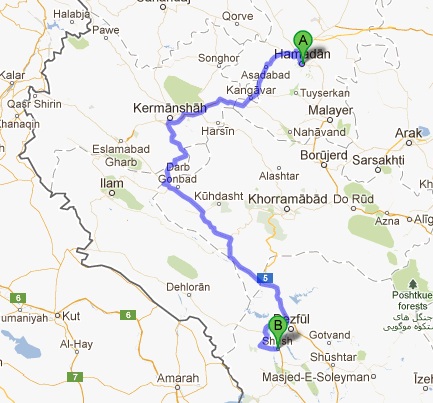 הנה מפת הגעה מהמדאן (A) לשושן (B), אם תרצו לעשות סיור בירות כשיהיה שלום. דרך כביש 48 זה 7 שעות ו-18 דקות, לא כולל פקקים.